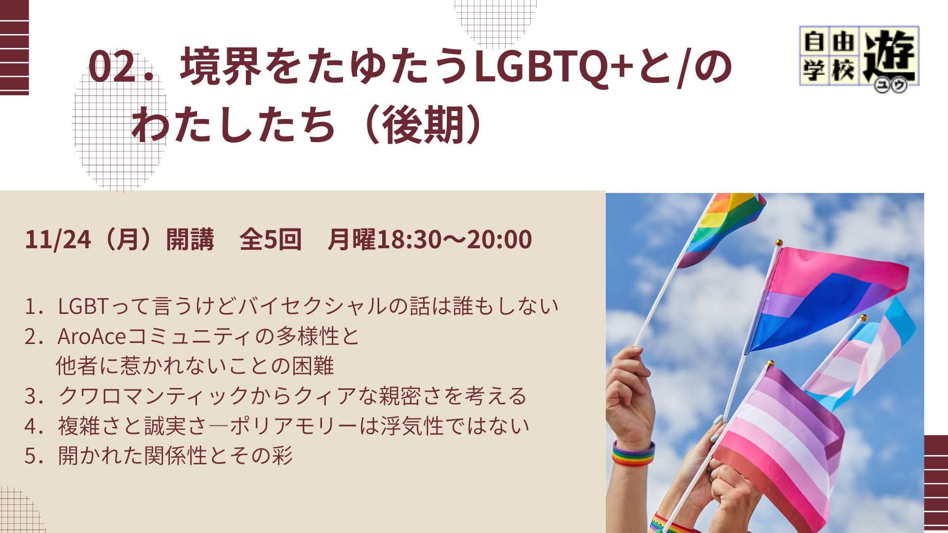 | 第1回 11/24(月) | LGBT って言うけどバイセクシュアルの話は誰もしない 異性/同性の区別なく恋愛/性愛を経験するバイセクシュアルやパンセクシュアルは、他の属性と比べてあまり議論されずにいました。バイセクシュアルの消去と呼ばれるこうした状況は、異性愛/同性愛や男女の二元論に基づいています。バイセクシュアルの実践を通じて、セクシュアリティに対する想像力の拡張を検討します。 |