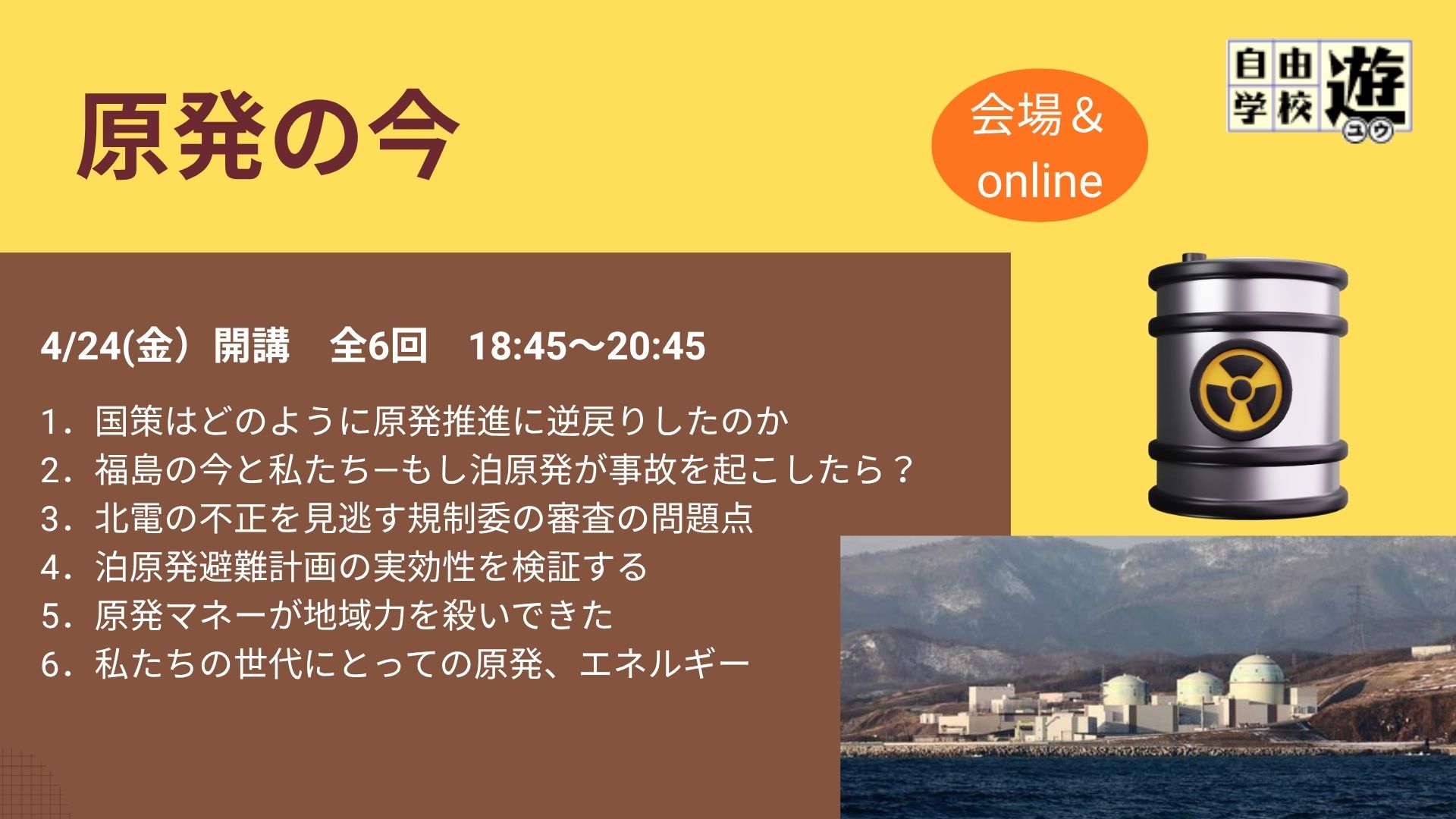 | 第4回 7/24(金) | 泊原発避難計画の実効性を検証する ◼ 井上敦子(泊原発を再稼働させない・核ゴミを持ち込ませない北海道連絡会) 穏やかな西風が吹く日に泊原発で大事故が起きると約6時間で札幌市まで放射性物質が届きます。そのとき、私たちは被ばくせずに逃げることができるのか、地震や大雪のときはどうなるのか、一緒に検証します。 |